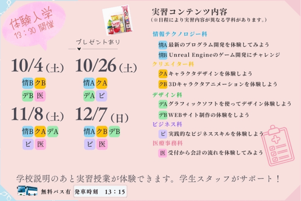 ※情報テクノロジー科、クリエイター科、デザイン科は、開催日により実習内容が異なります。