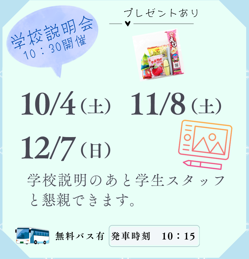 各イベントの開催日時等詳細は、ページ下の各イベント開催日程もしくは、学校案内パンフレット同封のイベントチラシでご確認ください。