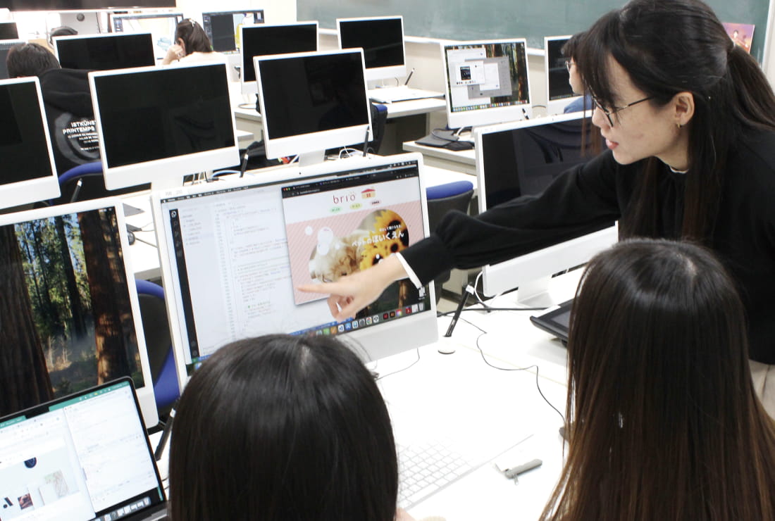 ポスターやパッケージ、広告、Webなど、さまざまな媒体を通して「伝わるデザイン」を学ぶ学科です。基礎から実践課題、作品発表まで段階的に学び、発想力と提案力を育てます。